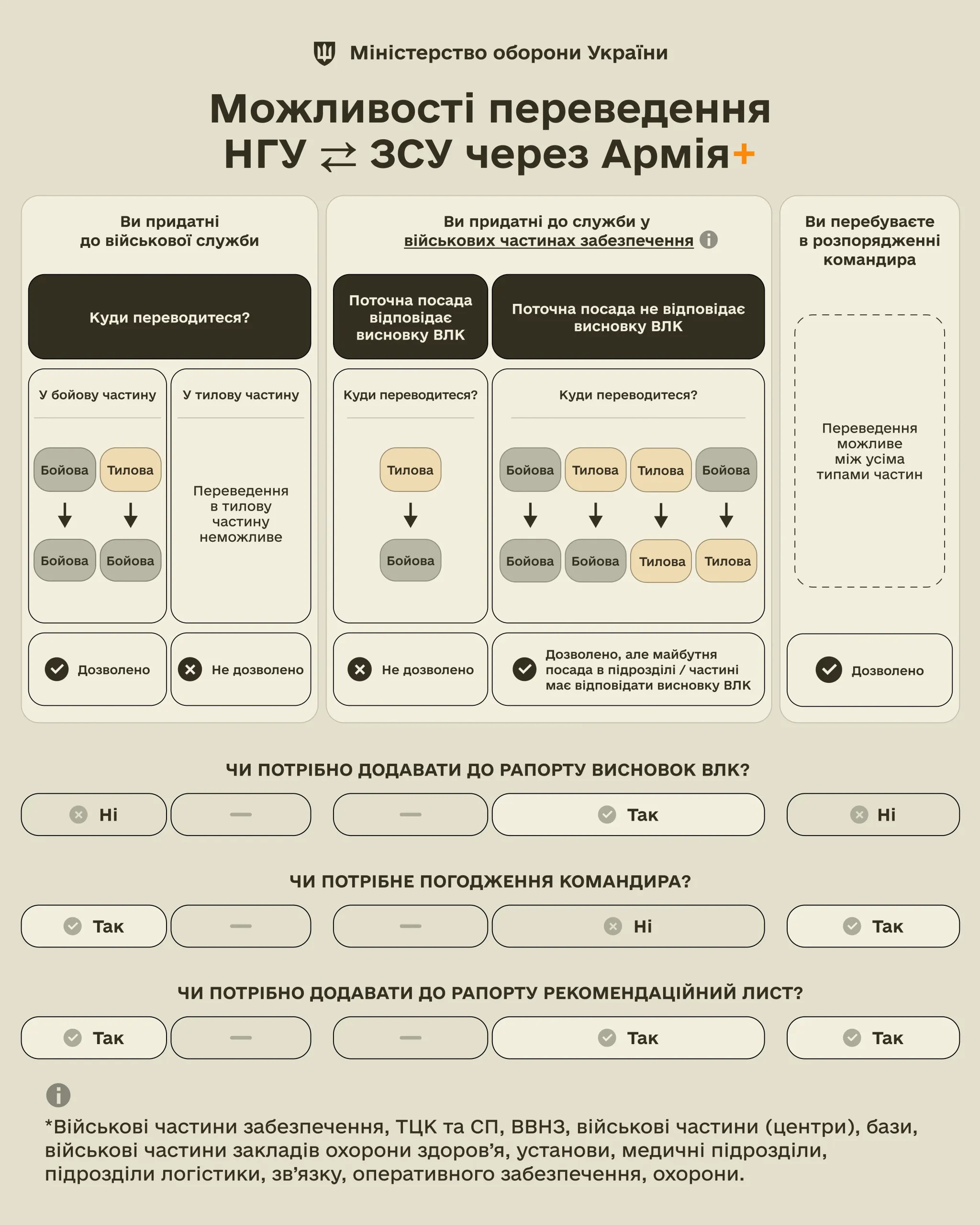 Військовослужбовцям, які направляються на тилові посади та за рішенням ВЛК непридатні до служби на поточній посаді, необхідно також надати висновок ВЛК. І для них не потрібне погодження командира частини.