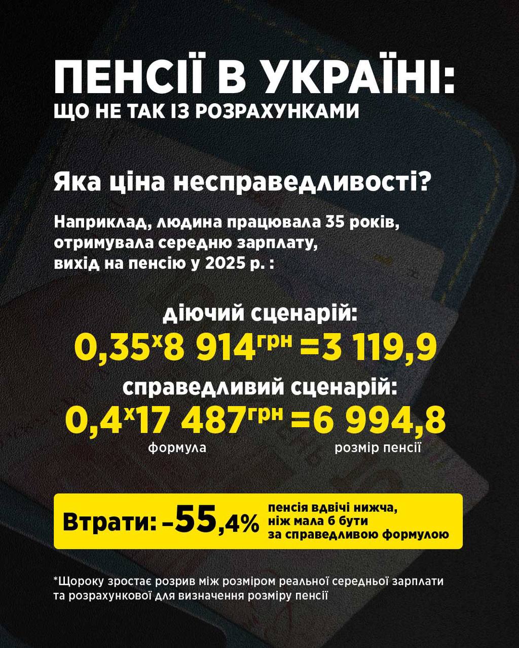 «Фінальний результат дії всіх перекручених формул — заниження пенсії на виході більш ніж удвічі. Людина, яка 35 років працювала і отримувала середню зарплату, сьогодні при виході на пенсію у 2025 році за чинною формулою отримуватиме лише близько 3119 грн. Тоді як за іншою, все ж таки більш справедливою, системою розрахунку пенсія мала б становити приблизно 6995 грн. «Дрібниця» у 55,4%, яка вирішує, чи людина зможе жити, чи буде виживати.